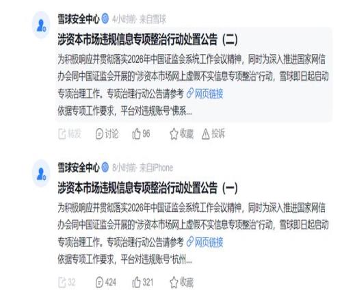 監管處罰發出后,雪球平臺開展了整治資本市場違規信息的專項行動。1月20日,雪球先后發布兩份《涉資本市場違規信息專項整治行動處置公告》,對相關違規賬號進行封禁。